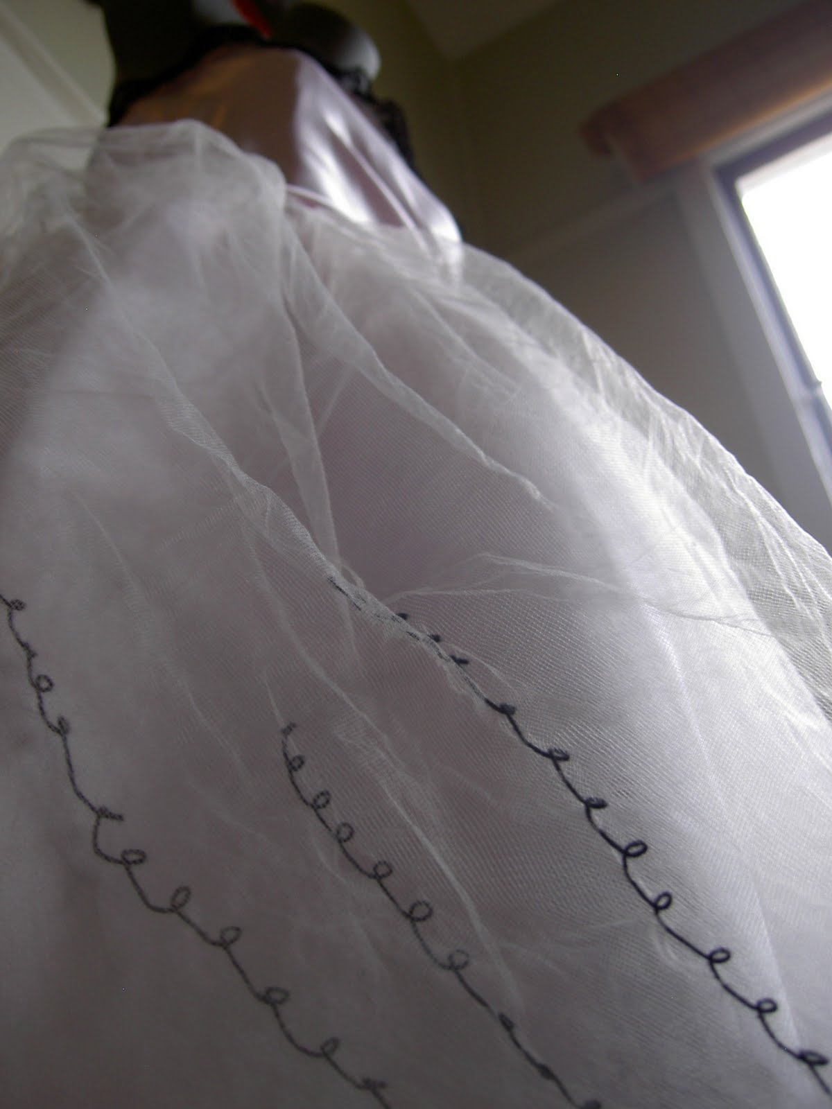 Lastly, there were a few rips in the pink tulle I needed to patch up. When you wear only secondhand stuff, mending is a permanent fixture of the landscape and finding a balance was hard with the tulle. How to mend the rips without destroying the delicacy of light pink mesh? Make it part of the detail of the skirt! I used a special swirly stitch* to make it look like everything I did was on purpose. Which it totally was.