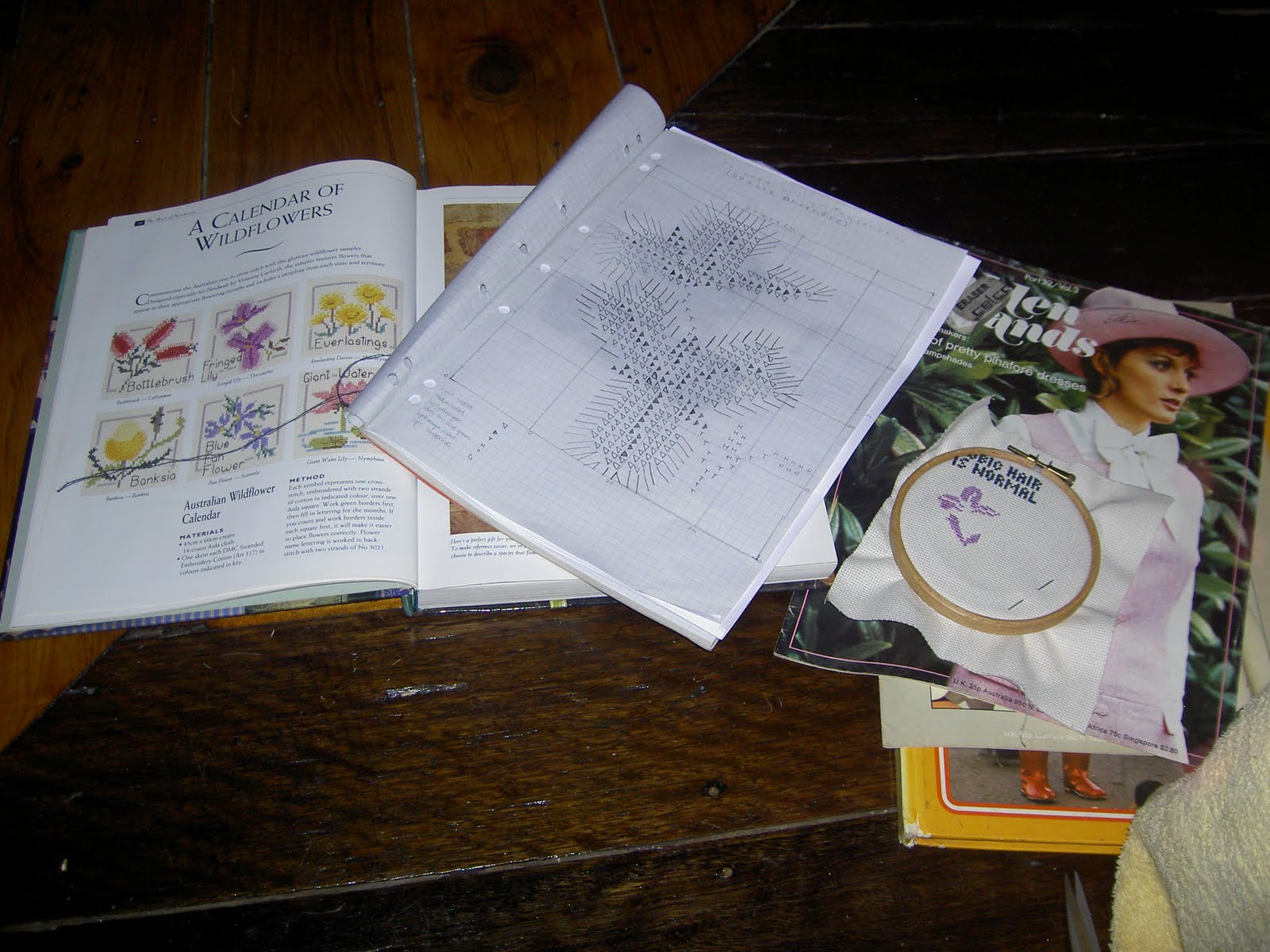 Here are a pile of my favourite books, depending on the subject…today’s search was ‘cross stitch’, so we have Beeton’s Book of Needlework (1870), Goldenhands no. 3 (1972), Best of Handmade by both Woman’s Day and Woman’s Weekly (1974 & 1991), and a book on calligraphy. I want to do some things with words.