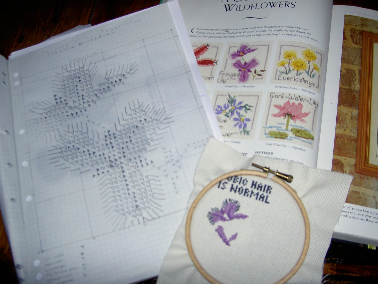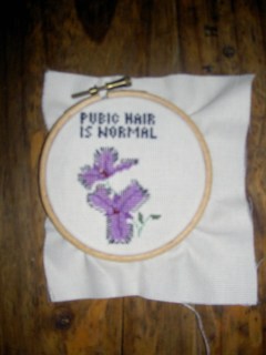 For my first stitchery, I chose the phrase ‘Pubic hair is normal’… There were other contenders, but when looking through one of the Best of Handmades I found a ‘delightful monthly floral calendar’ to stitch, and one of the flowers was the Thysanotus, commonly known as the ‘Fringed Lilly’. Double entendre, anyone?