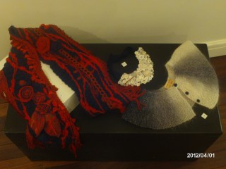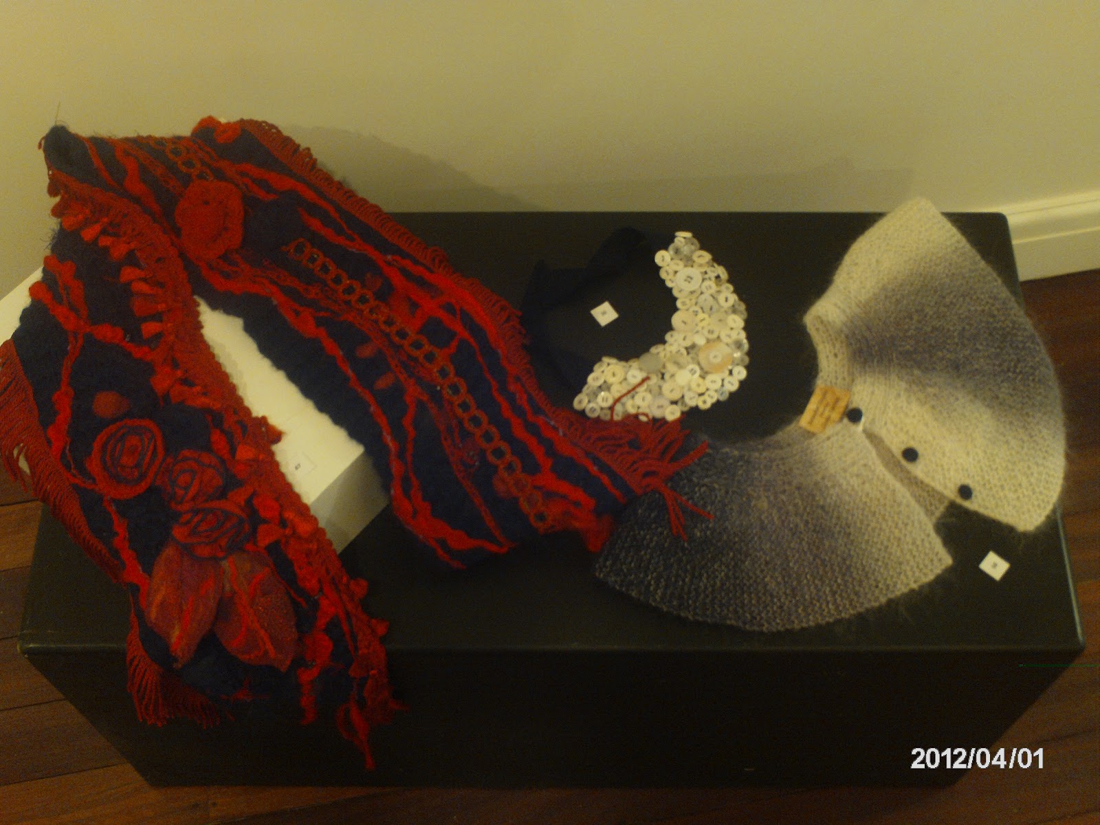 | Left to right: Grunske, Chunky Wool Neckwarmer, handknitted, felted, embellished. Grunske, Black Wool Neck Piece, wool, vintage buttons. Symes, Around the Shoulder, Kid mohair, cotton, acrylic. |