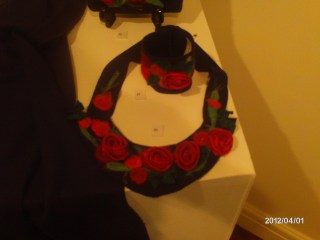 | Grunske, Black wool scarf, Black wool handbag, Black wool cuff, Black wool neckpiece. Needle embellished with wool and roses. |