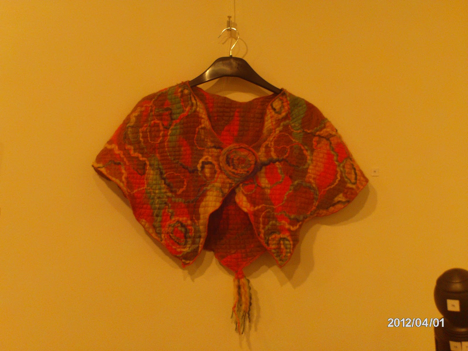 | Grunske, Orange Wool Shoulder Cape, stitched and layered, with beaded clasp. |