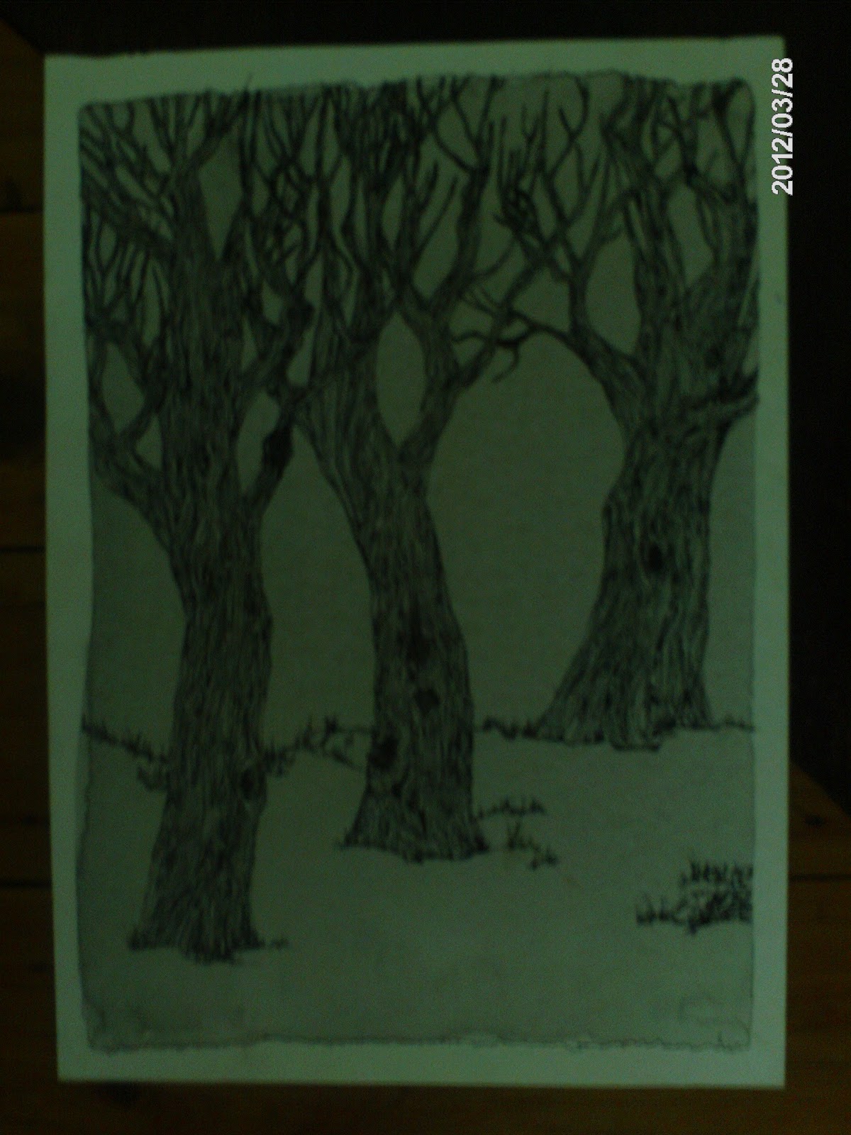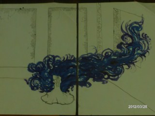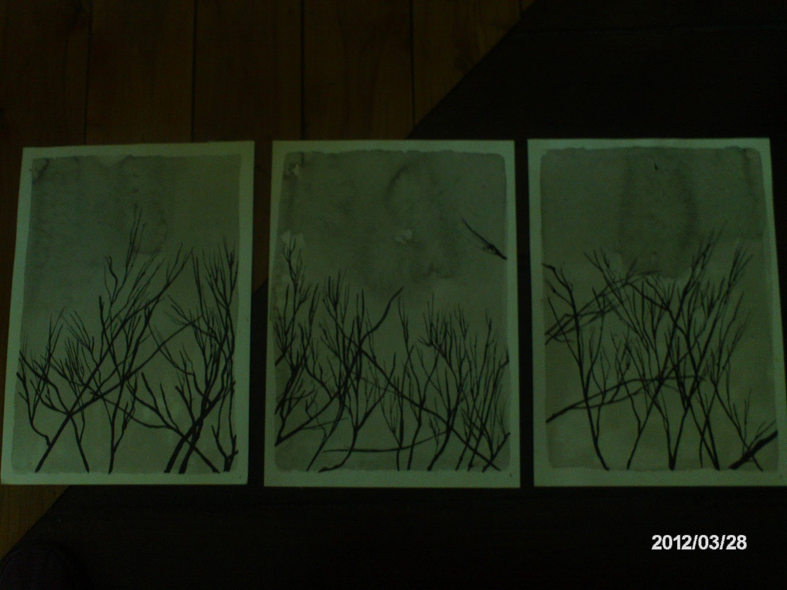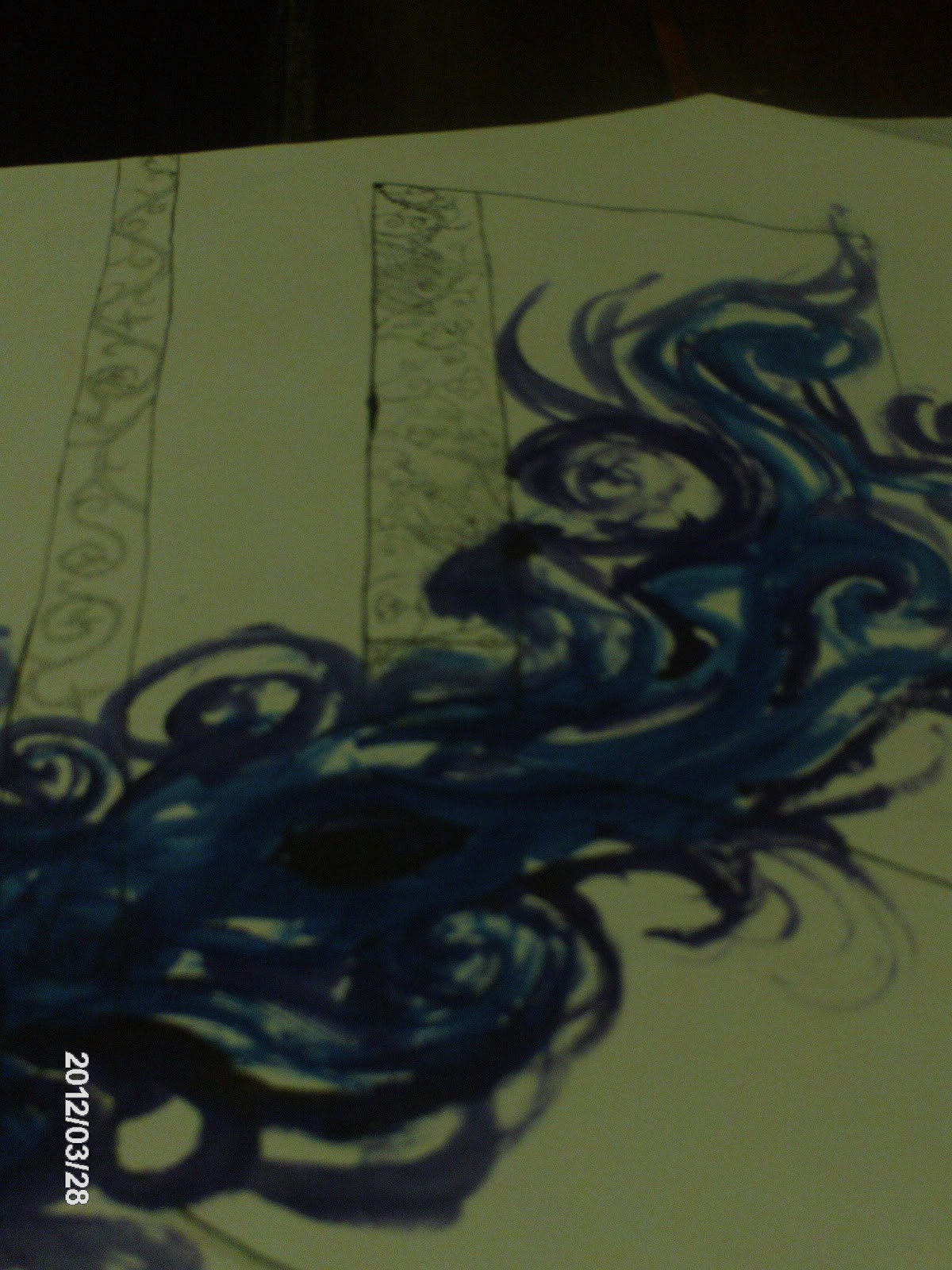 | Cleaning excess blue and purple paint off my brush turned into an excercise in complimentary blending and experiements in lines….afterwards, out came in ink and nib again. |