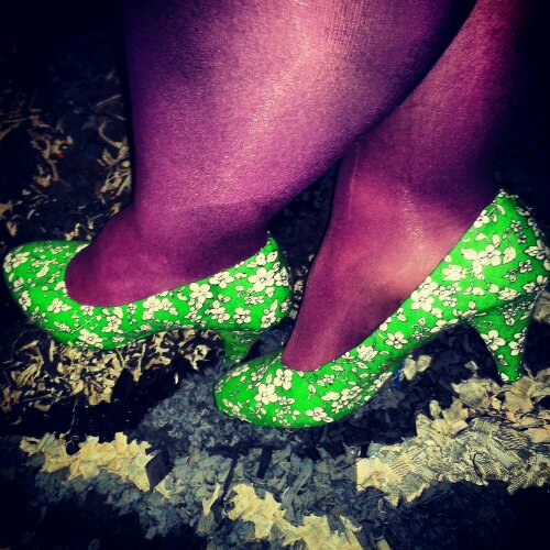 …which I sadly did not have, but I did have some bright green floral patterned stuff, and some very scuffed salmon coloured pumps. For the full tutorial on how to cover shoes, I recommend visiting the lovemaegan blog.