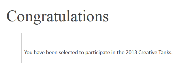 So, I have heard a reply on my application to Creative Tanks 2013. Wheeeee! This is great.