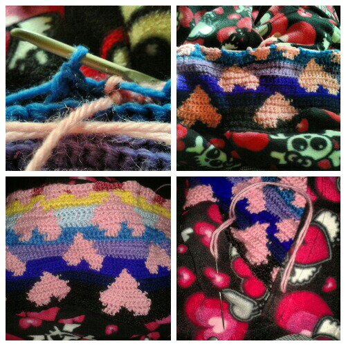 4. Crochet an extra piece – I chose a rainbow and hearts Fair Isle pattern, because what else was I doing? Nothing? Might as well do something unusual and mildly complicated!