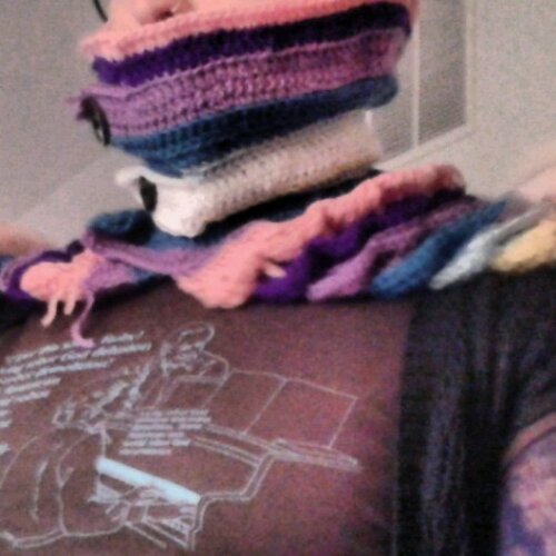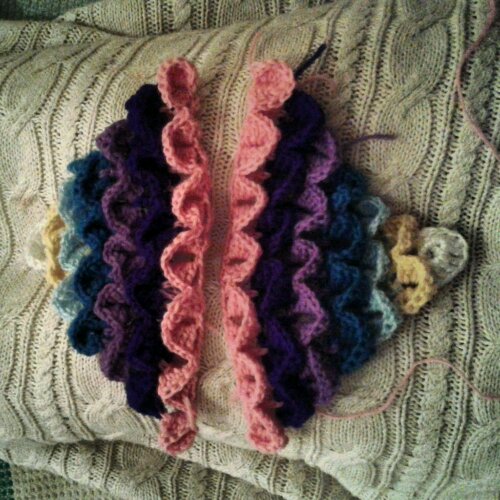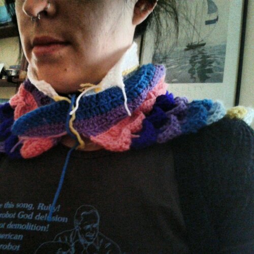 You should have two fasteners, with button holes, and the crochet collar comes up to the chin. Now to add another few centimetres of material for one last fastener, while flaring out the collar to correctly fit a human’s head.