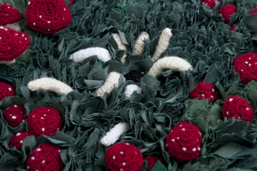 Amigurumi crochet sculpture and recycled material hook rug, Fairy-ring 3; Emergence pt. 5