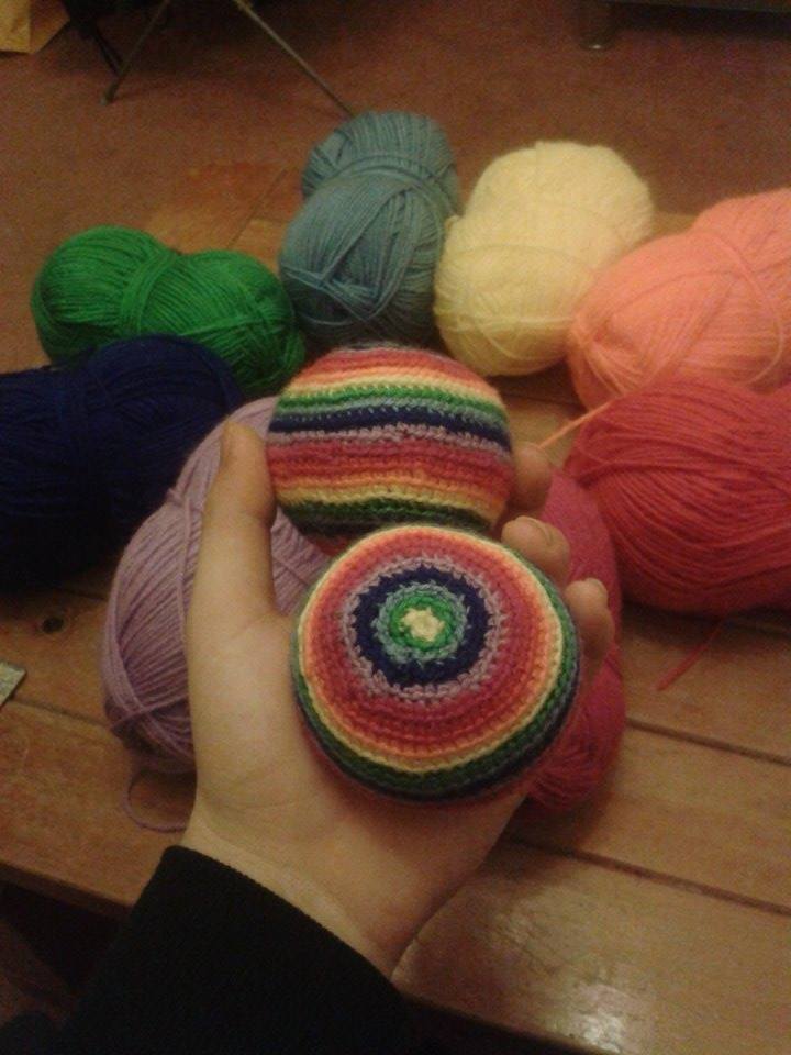 I have been screwing around, making some (sort of) functional things. I think something about the relatively nice weather Bath has been having of late has influenced my crocheting choices. So hacky sacks and poi all round!