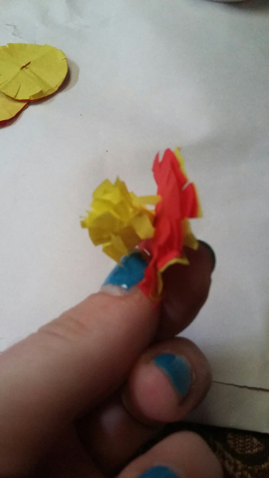 The process of making the mini paper marigolds are the same as making the larger ones, except for the stapling. Instead I sewed the paper circles together, a few stitches apiece.