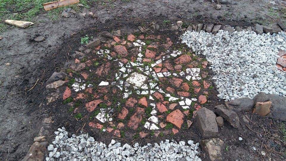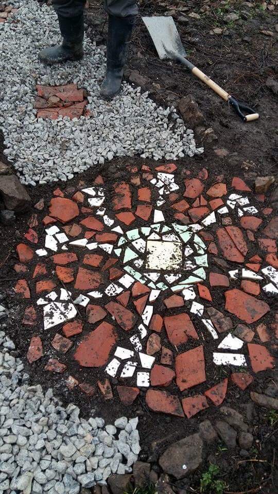 Crushed terracotta pieces for contrast against the gravel. Used some more found tiles and terracotta roof pieces to make the Olabe symbol.