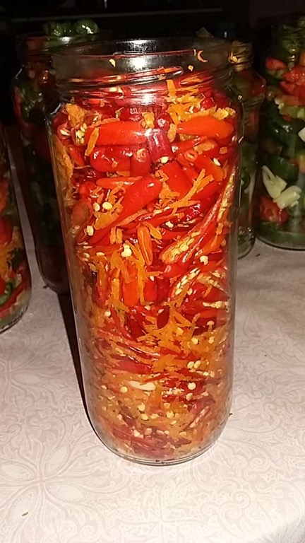 While I was preparing the pickle our host, Theresa was making mandarine marmalade and had some excess zest. I used this zest in the chilli pickle to add an extra citris flavour, and a little bit in one of the pimento jars.