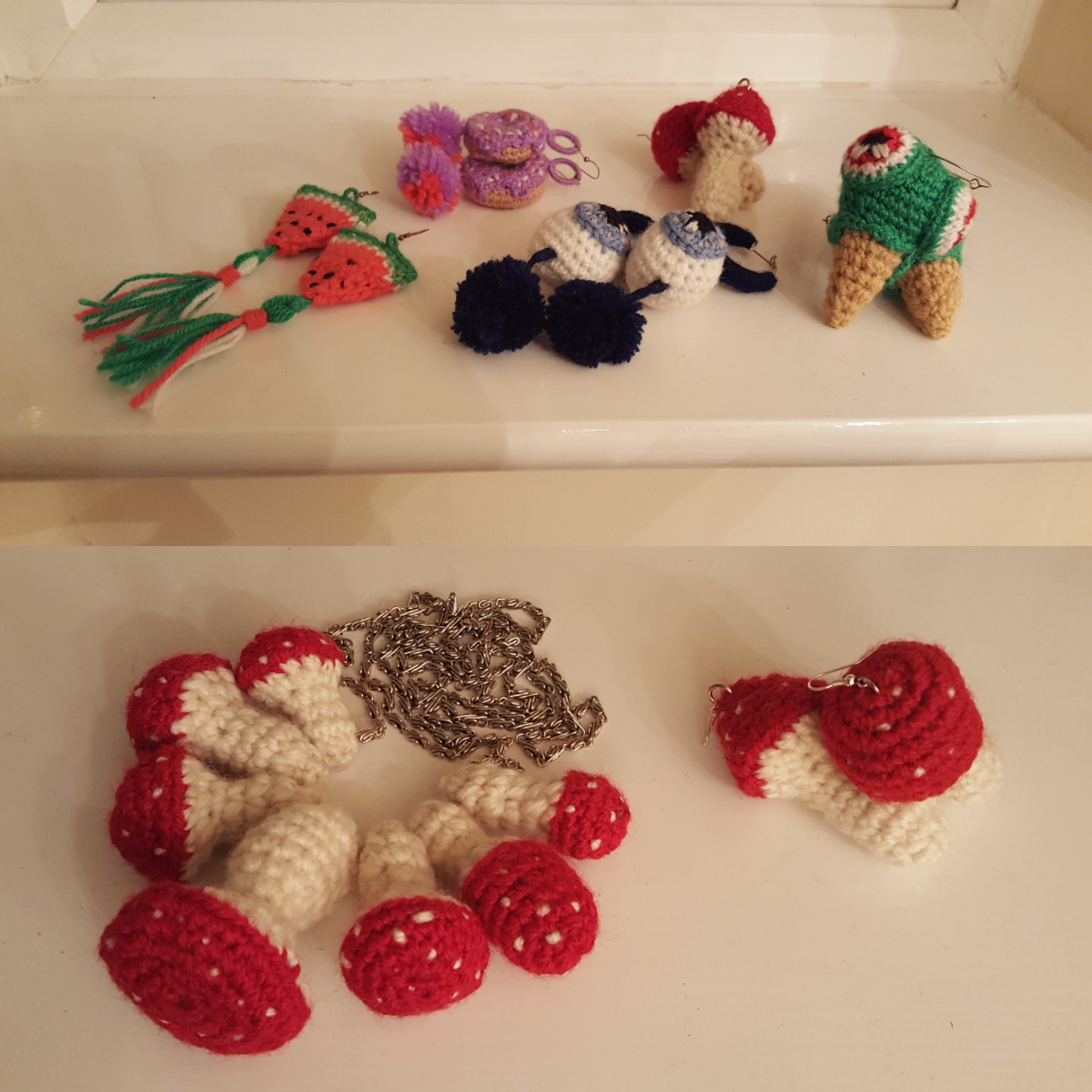 A few months previously I had knocked up a range of amigurumi figures and shapes I loosely refer to as ‘beads’ – fruit, pastry, ice creams, fungi, eyeballs, each under 10cm³ in size. I found some earring-bits while moving and spent the weekend designing some jewellery, adding pom-poms, tassels and other finishing touches.