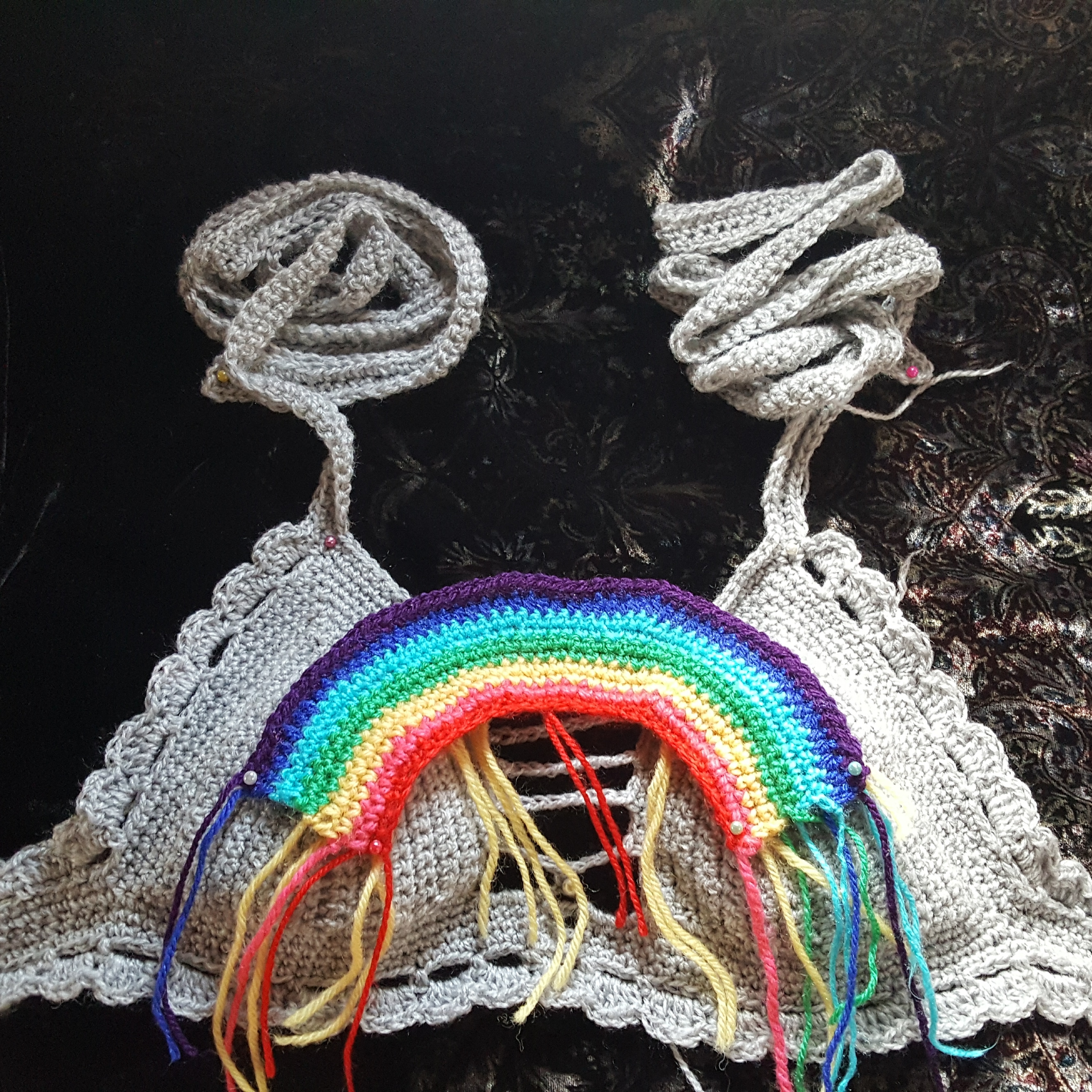 Another day, another crochet creation…crop top this time. Grey cloudy background, rainbow chest piece!