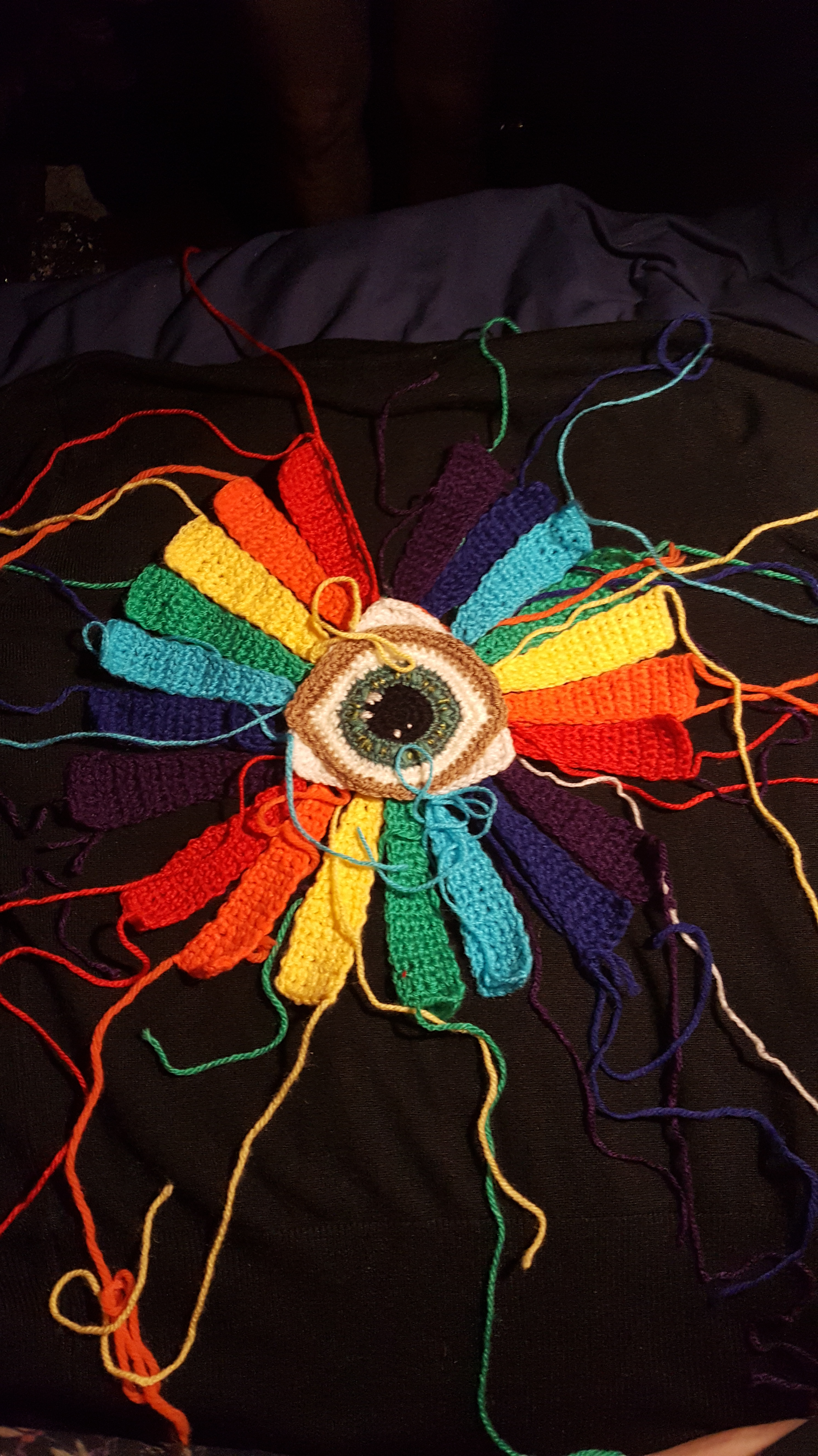 Rainbow crochet and my love of All Seeing Eyes combine into a cardigan.