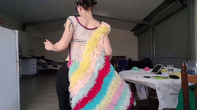 So again, here’s a gif of me happy dancing in the mostly-made pastel rainbow vest, one shoulder to go and I can see at this point it is coming together well. Watch me twirl! Wheeeeeeeeeeeee!